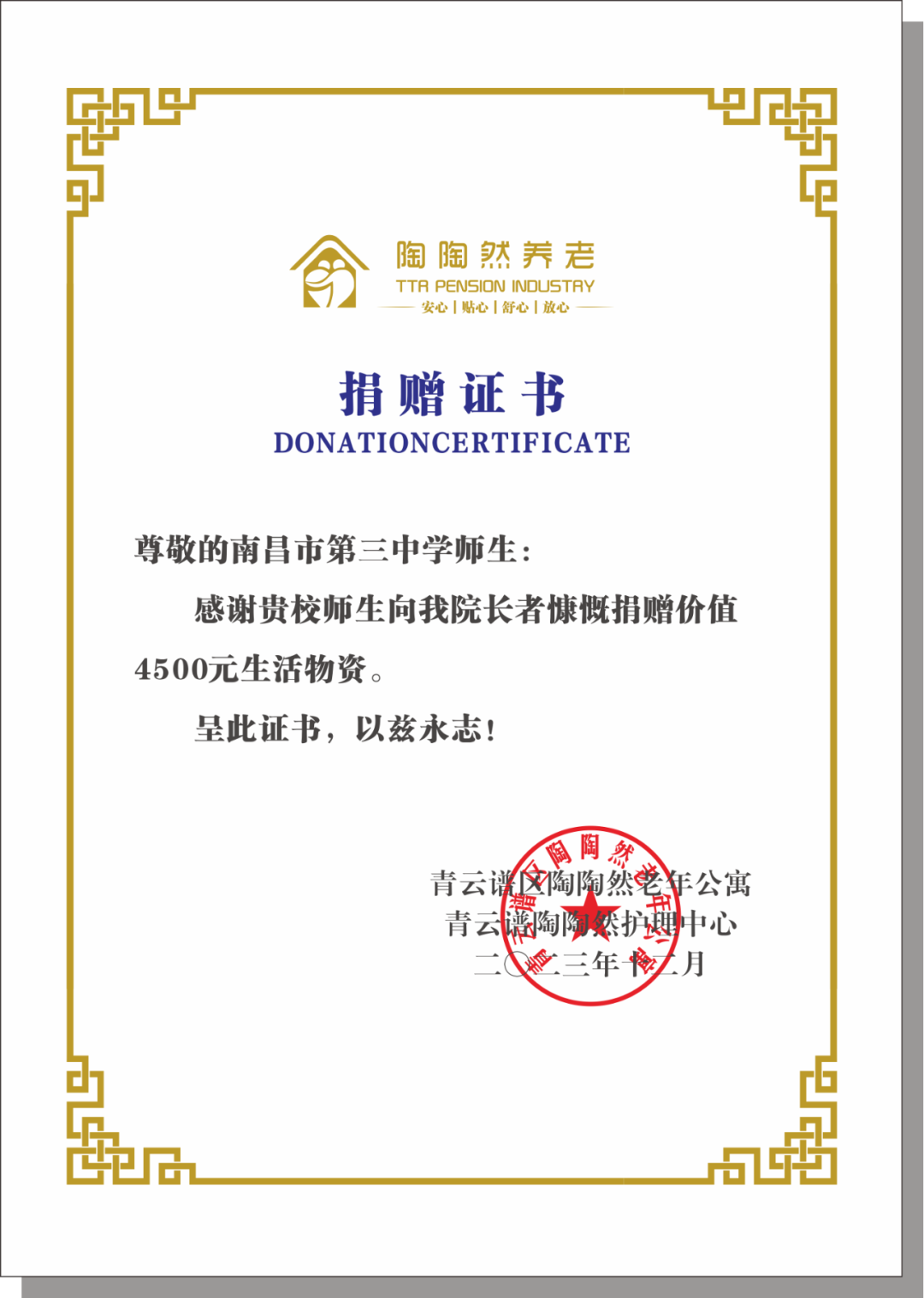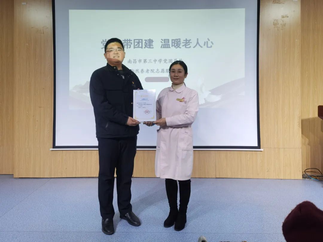 活动结束后,陶陶然老年公寓院长陶丽颁发“爱心单位”牌以及捐赠证书给南昌市第三中学,感谢他们为我们的老人做出的无私奉献和爱心。希望通过这次活动,能够进一步推动社会各界对老年人的关注和关爱,让我们一起为构建一个和谐、温馨的社会而努力!